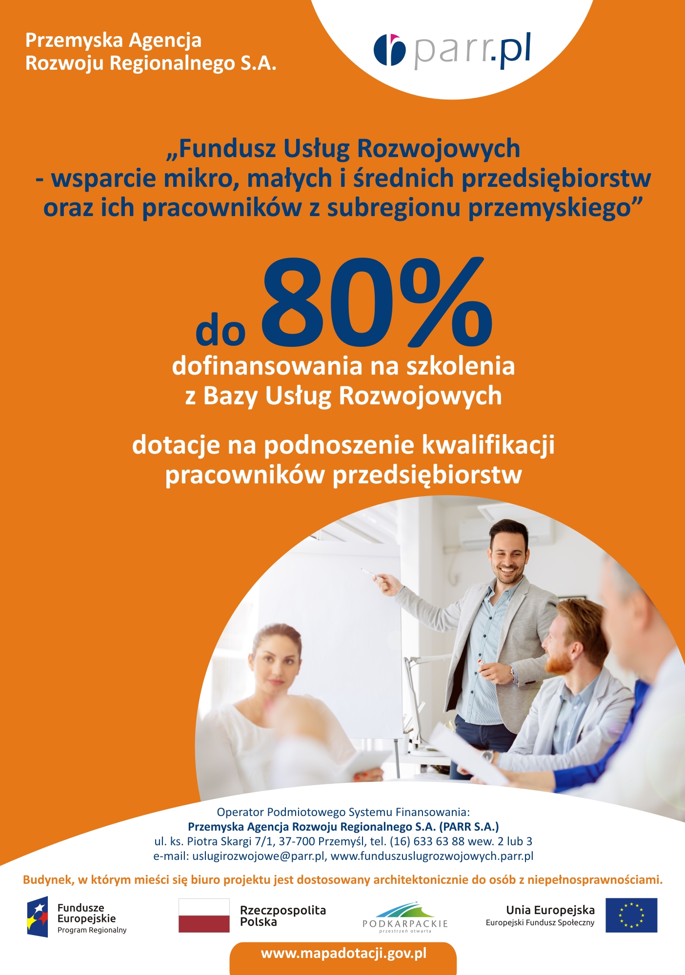 Miło nam poinformować, że Przemyska Agencja Rozwoju Regionalnego S.A. od 09 marca prowadzi XXIII nabór wniosków w ramach projektu „Fundusz Usług Rozwojowych – wsparcie mikro, małych i średnich przedsiębiorstw oraz ich pracowników z subregionu przemyskiego”.