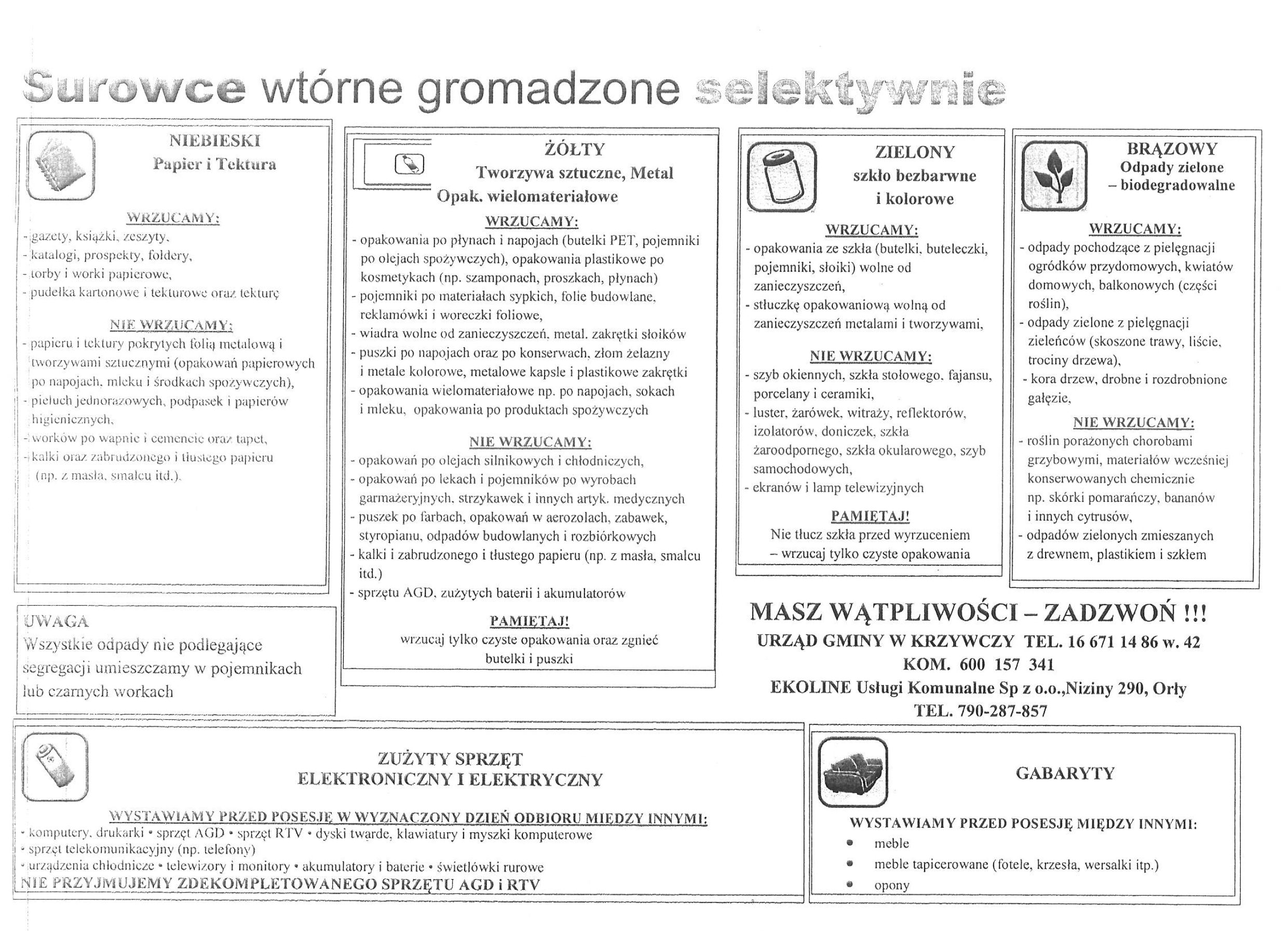 Harmonogram odbioru odpadów komunalnych, surowców wtórnych, odpadów zielonych, zużytego sprzętu elektronicznego i elektrycznego oraz gabarytów z Gminy Krzywcza na rok 2022.