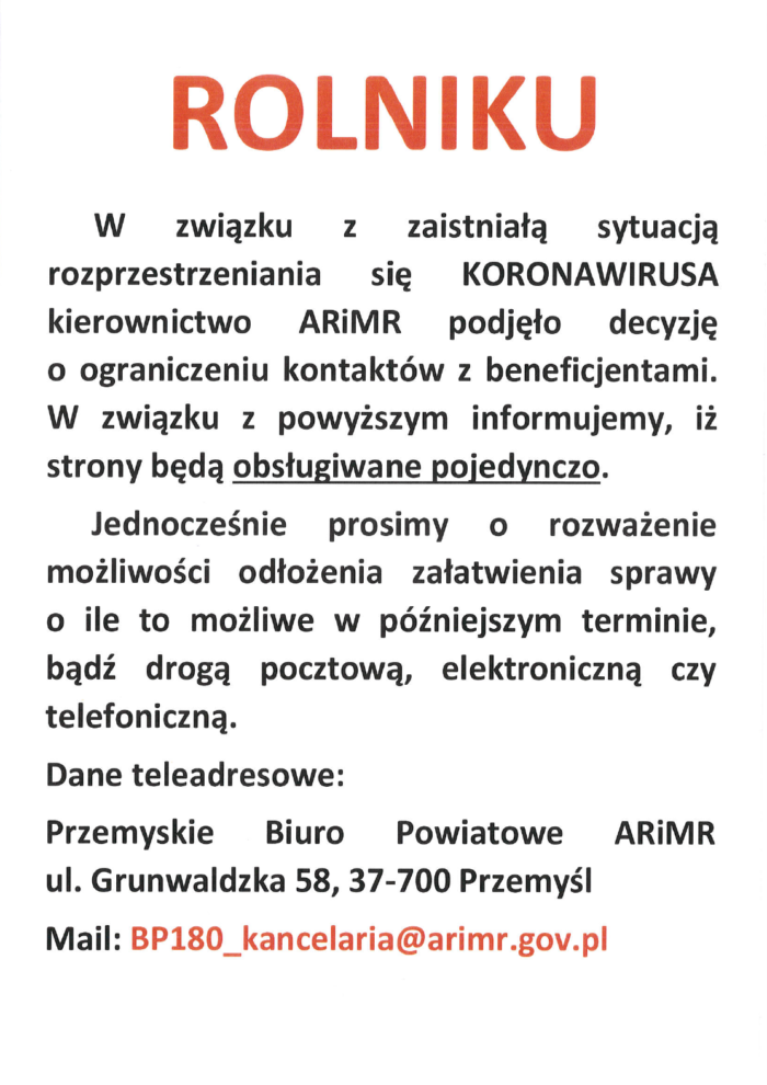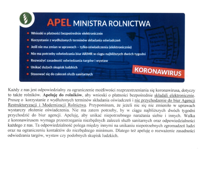 INFORMACJA ARiMR O OGRANICZENIU KONTAKTÓW Z ROLNIKAMI