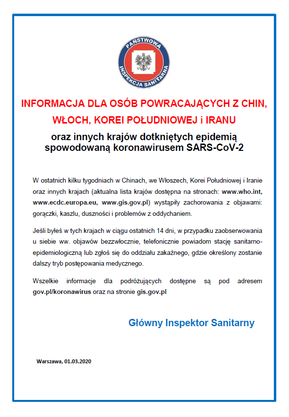 INFORMACJA DLA OSÓB POWRACAJĄCYCH Z KRAJÓW DOTKNIĘTYCH EPIDEMIĄ SPOWODOWANĄ KORONAWIRUSEM