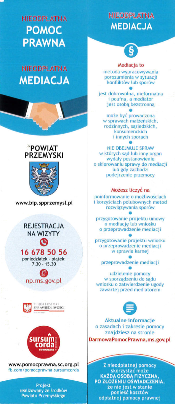 Na terenie Powiatu działają przez cały 2020 r. punkty nieodpłatnej pomocy prawnej i poradnictwa obywatelskiego, z których część prowadzi nasze Stowarzyszenie Sursum Corda („w górę serca”). Jest to zadanie z zakresu administracji rządowej, finansowane z budżetu państwa, ze środków przekazanych przez Starostwo Powiatowe, zgodnie z ustawą z dnia 5 sierpnia 2015 r. o nieodpłatnej pomocy prawnej, nieodpłatnym poradnictwie obywatelskim oraz edukacji prawnej.