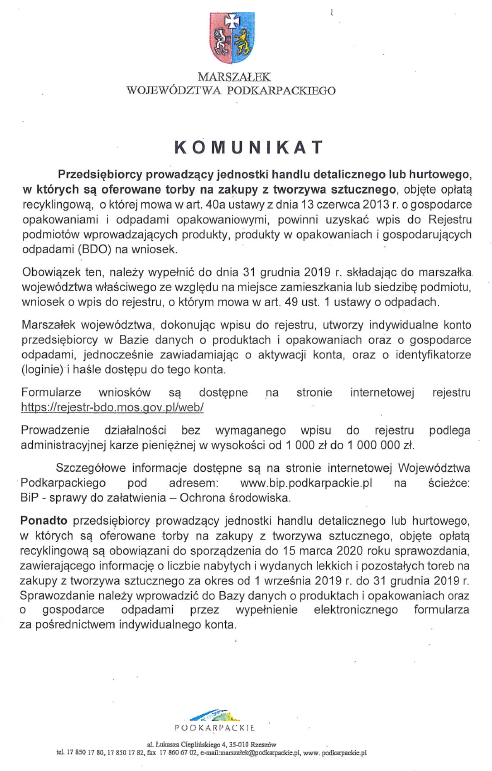 Przedsiębiorcy prowadzący jednostki handlu detalicznego lub hurtowego, w których są oferowane torby na zakupy z tworzywa sztucznego, objęte opłatą recyklingową są zobowiązani w terminie do dnia 31 grudnia 2019 r. uzyskać wpis do Rejestru podmiotów wprowadzających produkty, produkty w opakowaniach i gospodarujących odpadami (BDO).