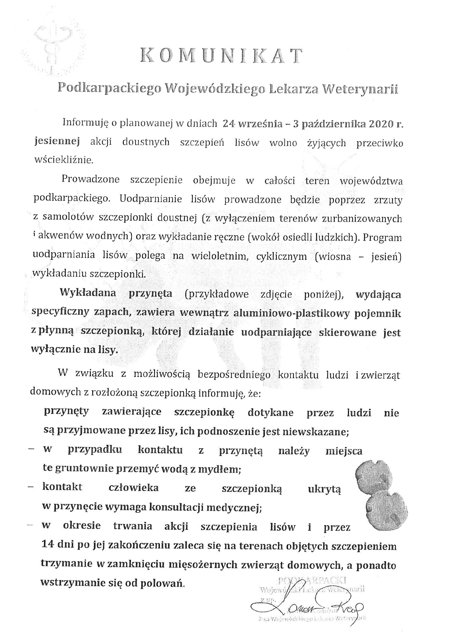 Komunikat Podkarpackiego Wojewódzkiego Lekarza Weterynarii o jesiennej akcji szczepień lisów