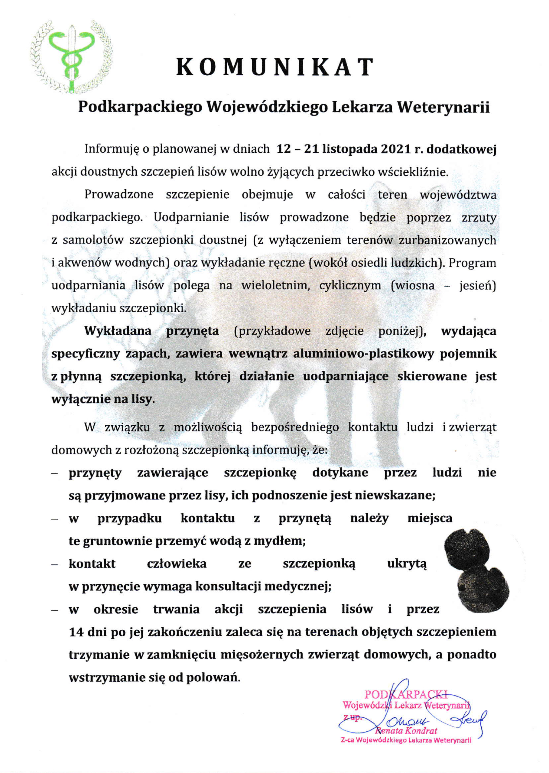 Komunikat Podkarpackiego Wojewódzkiego Lekarza Weterynarii o planowanej w dniach 12-21 listopada 2021 r. dodatkowej akcji doustnych szczepień lisów wolno żyjących przeciwko wściekliźnie
