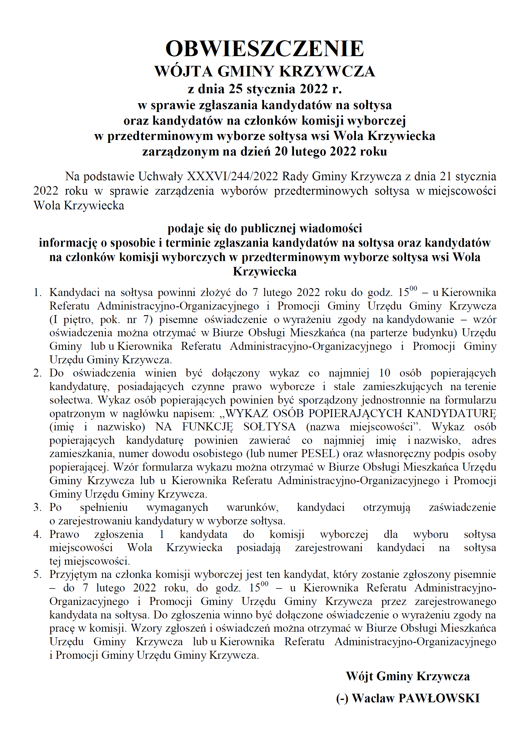 Obwieszczenie Wójta Gminy Krzywcza z dnia 25 stycznia 2022 r. w sprawie zgłaszania kandydatów na sołtysa oraz kandydatów na członków komisji wyborczej w przedterminowym wyborze sołtysa wsi Wola Krzywiecka zarządzonym na dzień 20 lutego 2022 roku