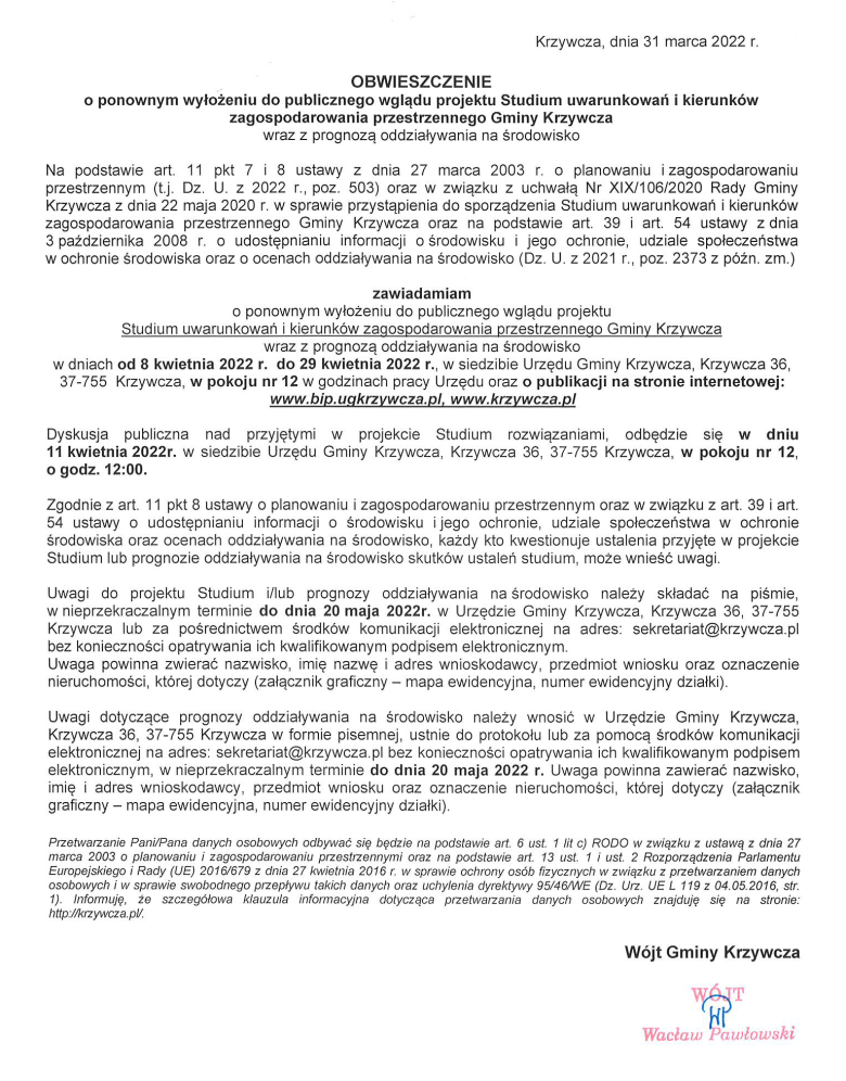 Obwieszczenie Wójta Gminy Krzywcza z dnia 31 marca 2022 r. o ponownym wyłożeniu do publicznego wglądu projektu Studium uwarunkowań i kierunków zagospodarowania przestrzennego Gminy Krzywcza wraz z prognozą oddziaływania na środowisko