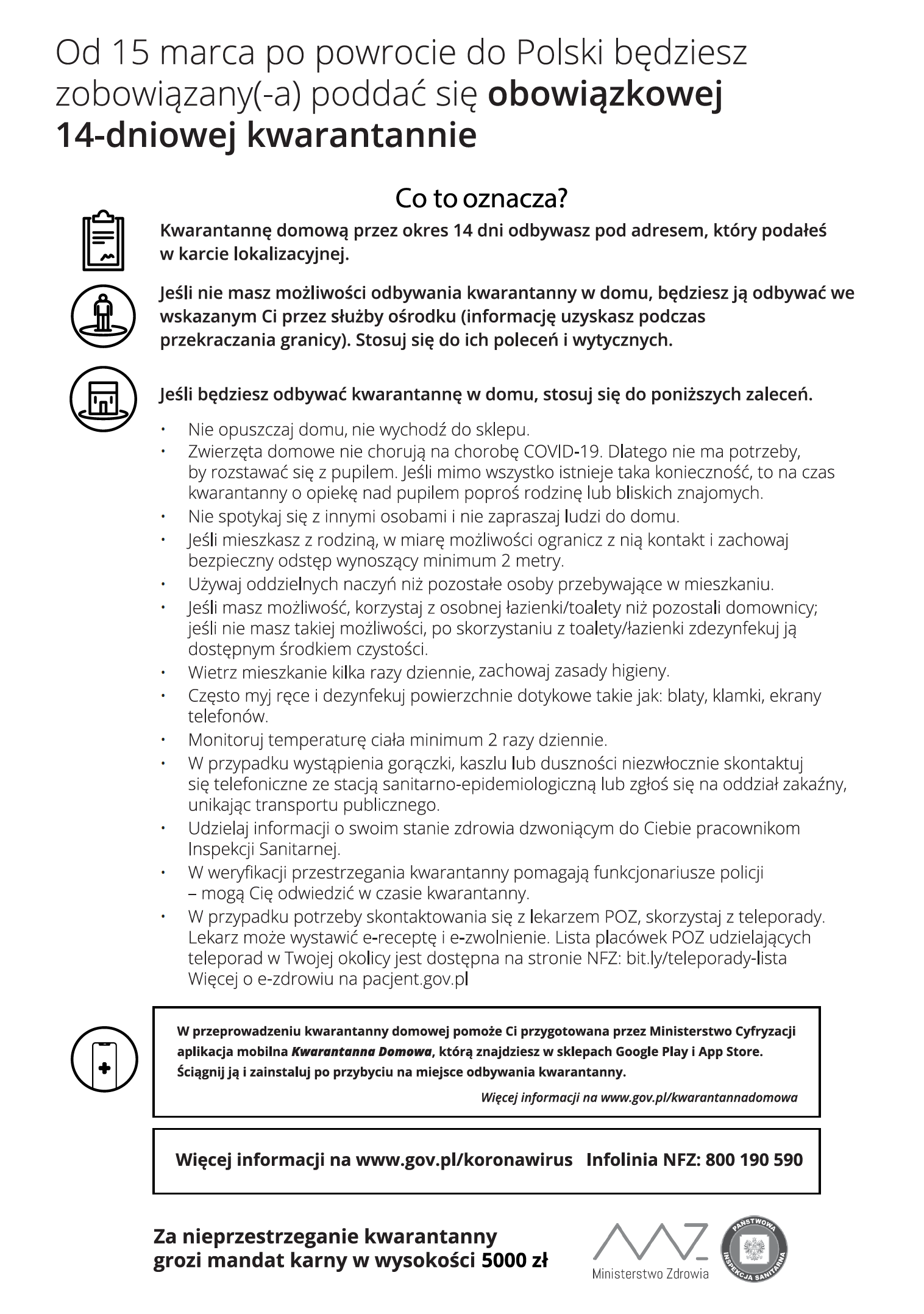 OD 15 MARCA PO POWROCIE DO POLSKI OBOWIĄZKOWA KWARANTANNA – INFORMACJE