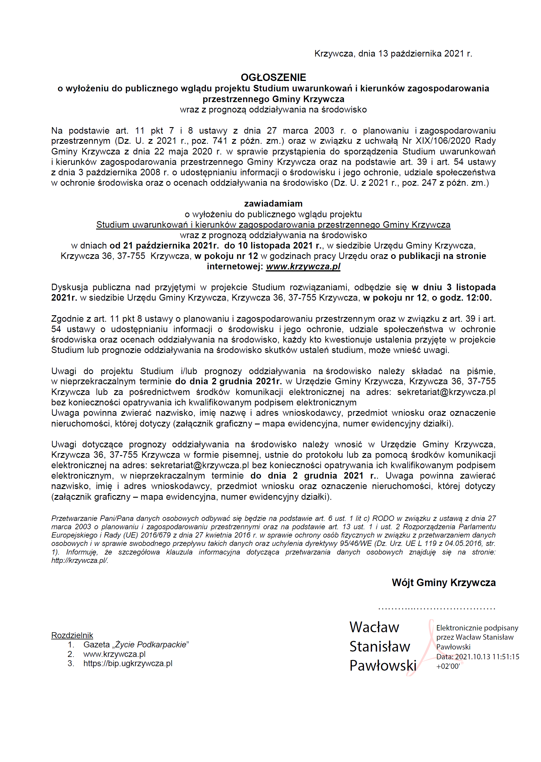 Ogłoszenie Wójta Gminy Krzywcza z dnia 13 października 2021 r. o wyłożeniu do publicznego wglądu projektu Studium uwarunkowań i kierunków zagospodarowania przestrzennego Gminy Krzywcza wraz z prognozą oddziaływania na środowisko