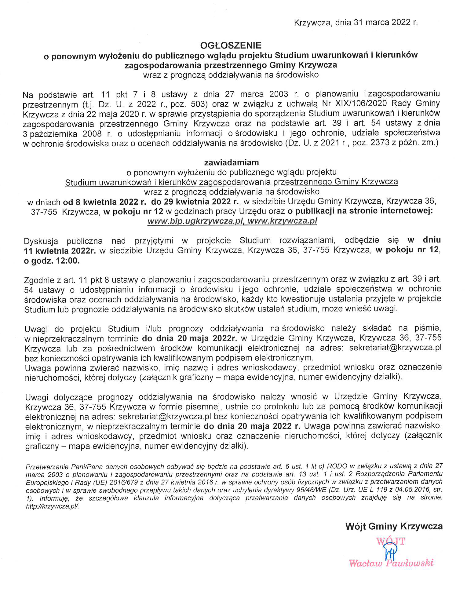 Ogłoszenie Wójta Gminy Krzywcza z dnia 31 marca 2022 r. o ponownym wyłożeniu do publicznego wglądu projektu Studium uwarunkowań i kierunków zagospodarowania przestrzennego Gminy Krzywcza wraz z prognozą oddziaływania na środowisko