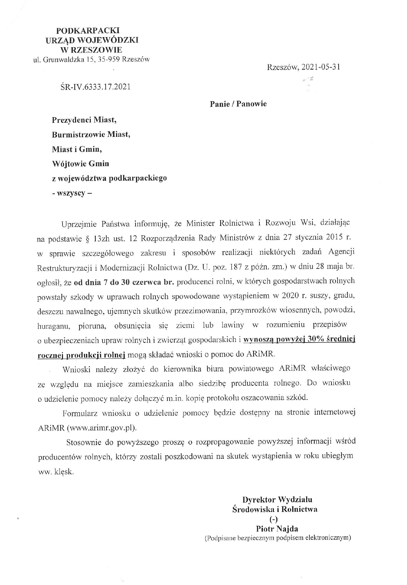 Producenci rolni, w których gospodarstwach rolnych postały szkody w uprawach rolnych spowodowane wystąpieniem w 2020 r. suszy, gradu, deszczu nawalnego ujemnych skutków przezimowania, przymrozków wiosennych, powodzi, huraganu, pioruna, obsunięcia ziemi lub lawiny mogą składać wnioski o pomoc w dn. 7-30 czerwca 2021 r. do ARiMR