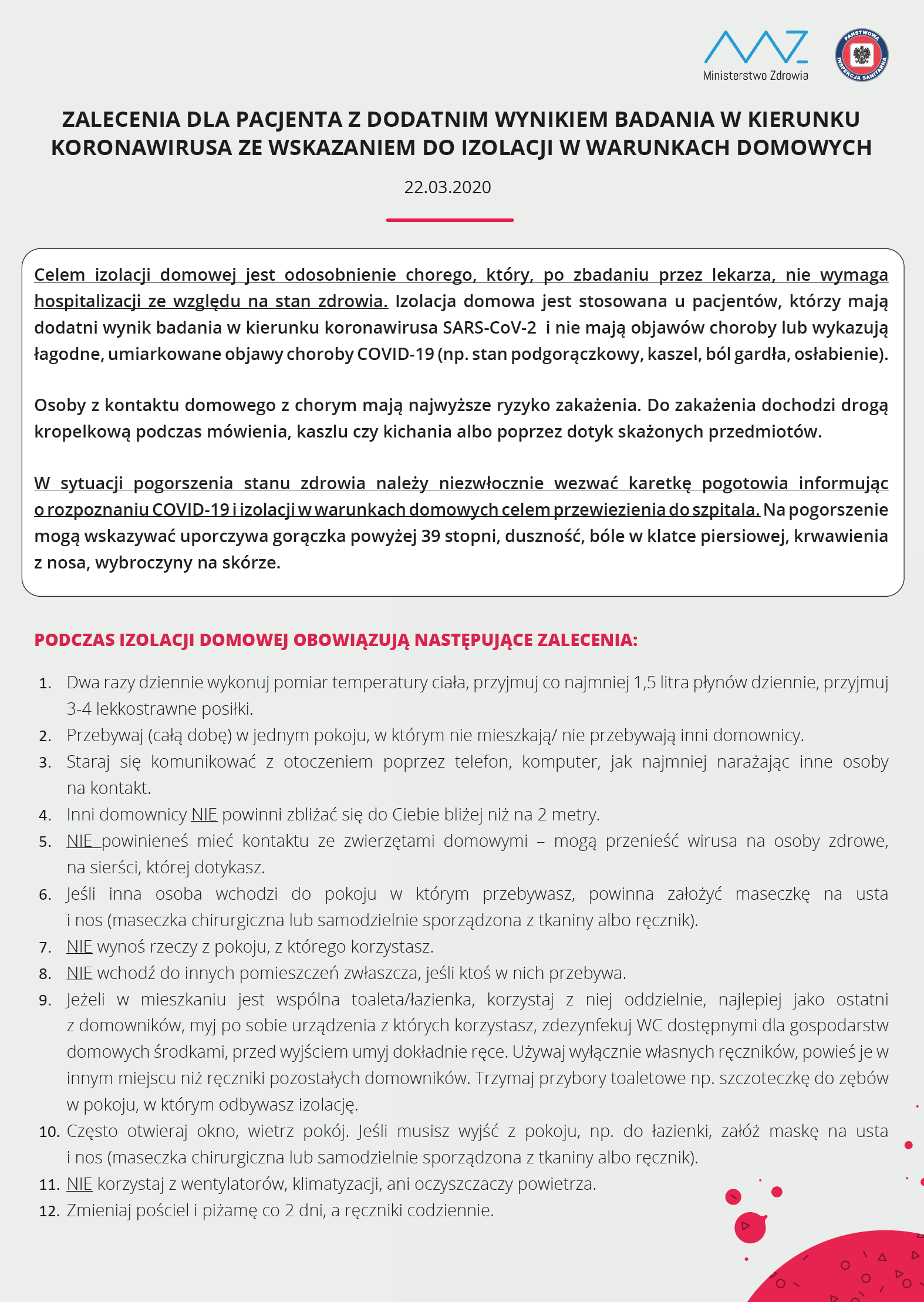ZALECENIA DLA PACJENTA Z DODATNIM WYNIKIEM BADANIA W KIERUNKU KORONAWIRUSA ZE WSKAZANIEM DO IZOLACJI W WARUNKACH DOMOWYCH