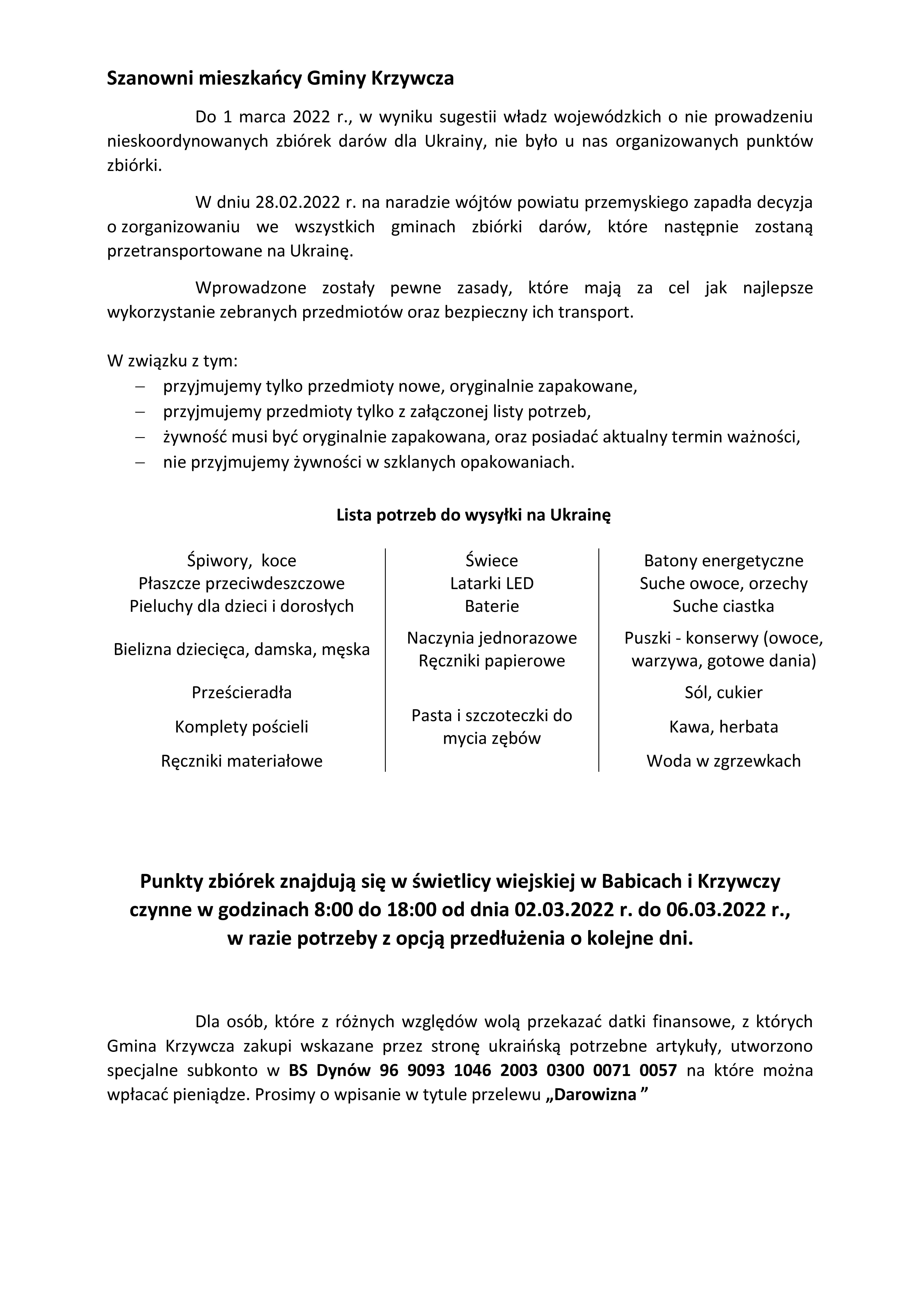 Komunikat Wójta Gminy Krzywcza w sprawie zorganizowania zbiórki darów dla Ukrainy